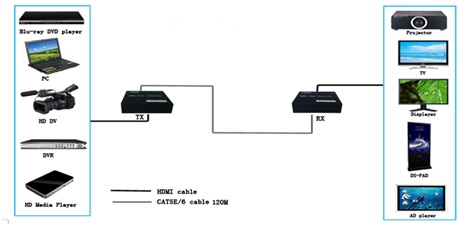HDMI Extender over cat5/cat6 extends HDMI/DVI signals to remote places. It could extend HDMI video signal up to 120 meter with normal 8 core cat5e/6/7 cable with 1080p resolution. High bandwidth, no loss, no delay, plays real time HD video at remote places. Widely used in computing and surveillance systems, big screen advertisement system, video wall, bank, stock market, education system etc