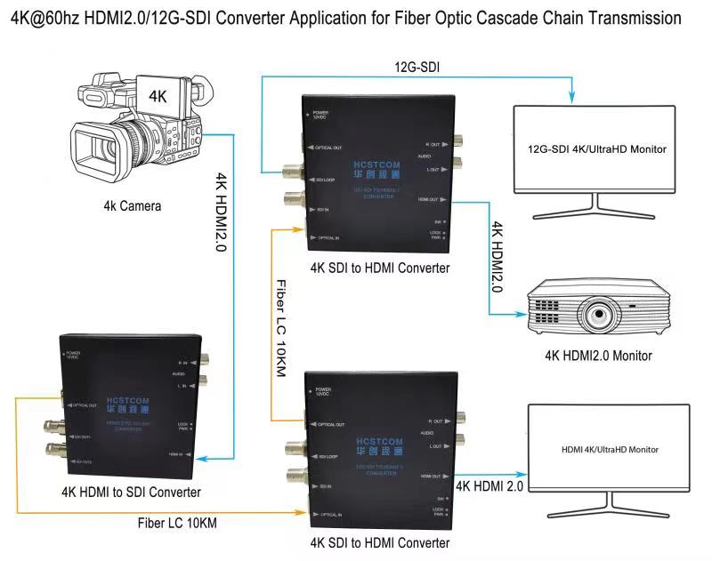 The HDMI 2.0 to 12G-SDI converter produced by Beijing HCSTCOM Co.,Ltd converts HDMI2.0 signals to12G-SDI,Achieving 4K/UHD single link output. It includes2-ch 12G-SDI distributed amplifier outputs. Supports 1 SFP optical port output,Supports transmission of HDMI 4K/ UHD signal up to10-80km through single-mode single-fiber. Supports 2-channels of embedded audio from an HDMI source or two-channel analog audio (RCA) input. It can be used together with our 12G-SDI fiber receiver as HDMI input and SDI output fiber extender
